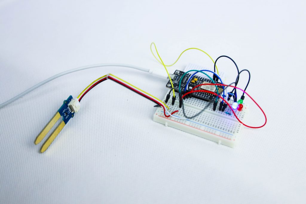 Het bestaat uit een Nodemcu, male wires, een vochtigheidsmeter, LED-lichtjes, wit bordje, een breadboard, IFTTT app.