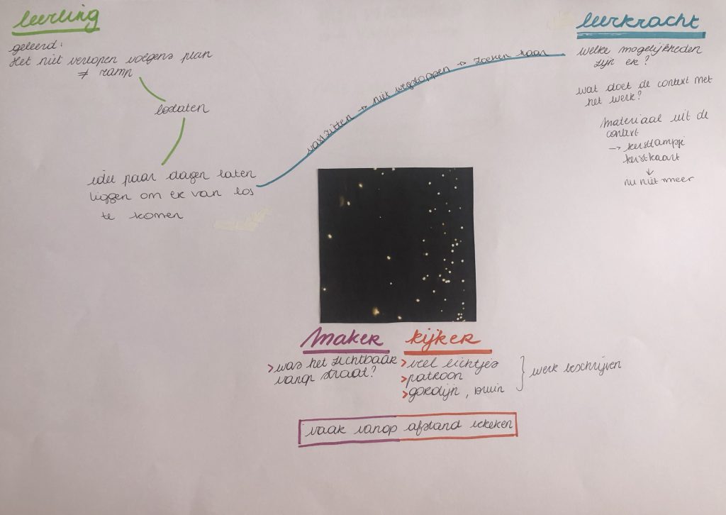 Doorheen het hele werk heb ik zowel als leerkracht als als maker de materialen uit de context gehaald. Het was een kerstkaart, nu een installatie. Het waren kerstlampjes, nu symbolische lampjes. Het was ook nodig voor mij om dit uit de context te halen op een of andere manier om als leerling er anders naar te kijken en er mee verder te kunnen. Maar ook als maker om mij kijker te kunnen maken. Als maker vraag ik mij nu ook af of het zichtbaar was op straat deze installatie.