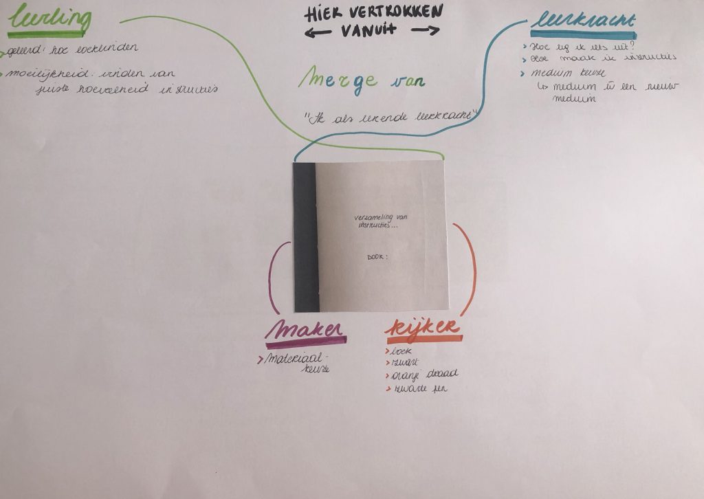 Hier vond ik het moeilijk om leerkracht en leerling op te splitsen want ik voelde mij hier echt een lerende leerkracht. Ik leerde als leerling hoe je een boek moet maken, ik leerde als lerende leerkracht dat het moeilijk is om een juiste hoeveelheid instructies te vinden. En als leerkracht stelde ik mij ook de vraag: Hoe leg ik iets duidelijk uit? Hoe doe ik dat op papier? Hoe maak ik goede instructie?