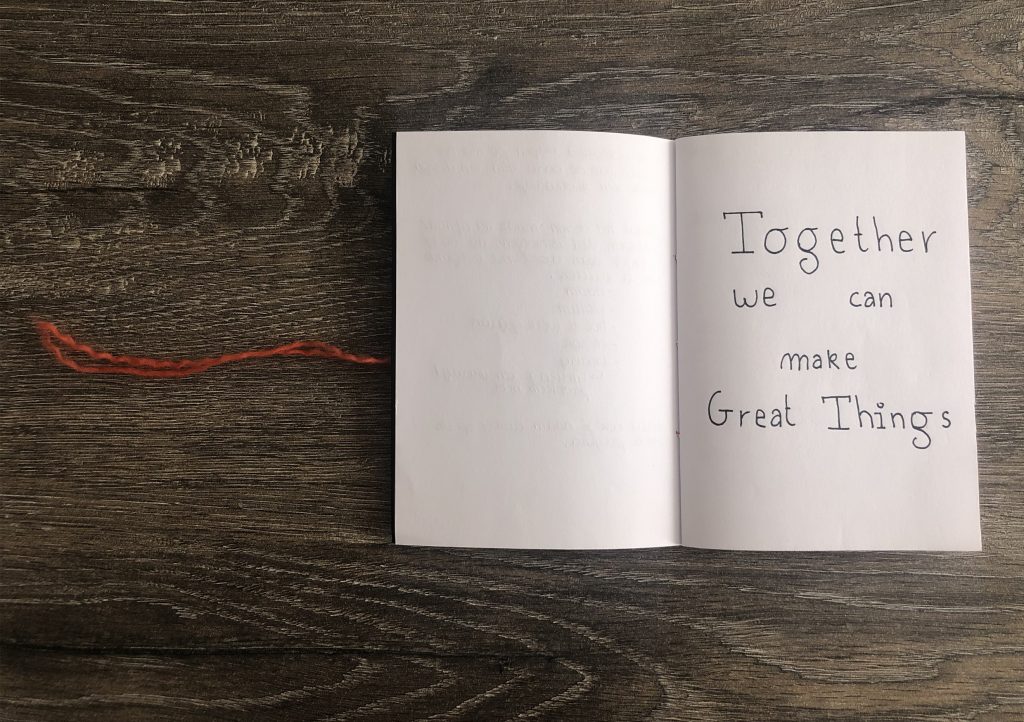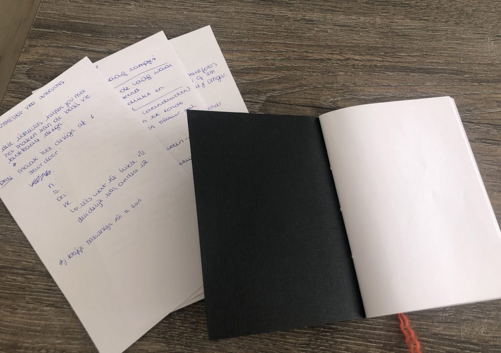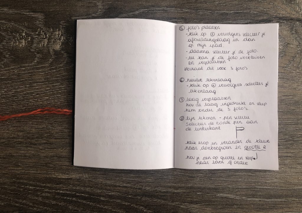 Wat ik gemaakt heb is een klein boekje waar de hele uitleg in staat. Dit boekje heb ik zelf gesneden en gebonden dus het is volledig fysiek gemaakt. In het boekje staan alle instructies om het ontwerp zelf te maken. Na de instructies staan invulpagina’s en vraag ik aan de lezers van het boekje om het ontwerp af te maken, het ontwerp dat ik heb gemaakt is namelijk een prototype en is nooit afgewerkt. Op de invulpagina’s moeten zij vervolgens schrijven wat ze hebben gedaan om ontwerp af te maken. Tot slot moeten ze hun naam op de titelpagina bij schrijven. Er staat “Verzameling van instructies… door: “. Door iedereen die het boekje heeft aangevuld.